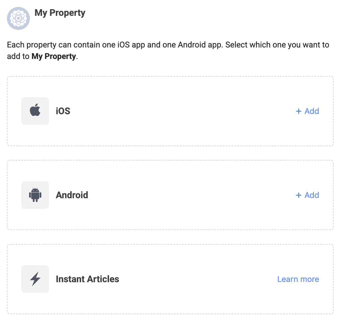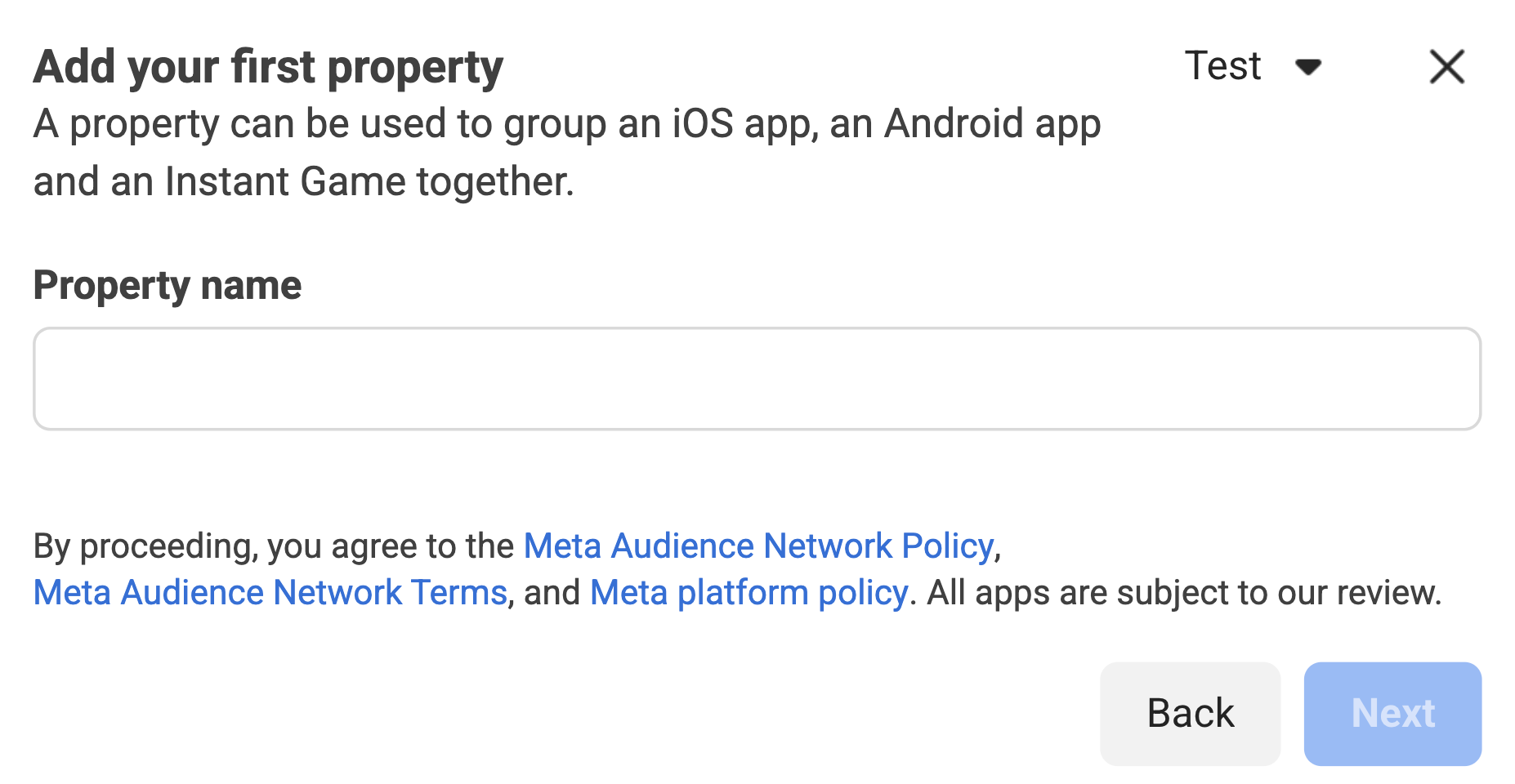 After you've filled out the required information, you're prompted to create a property for your app. Enter the desired name of the property for your app and click Next.