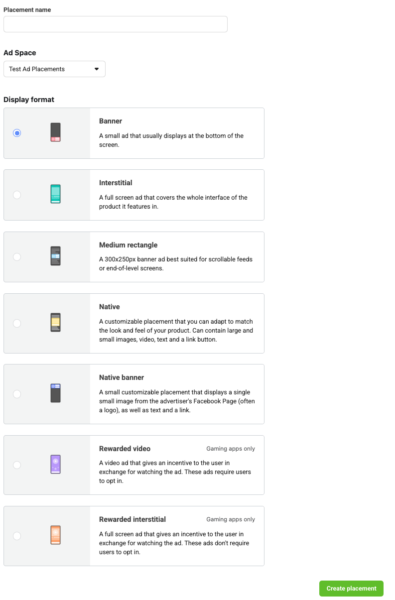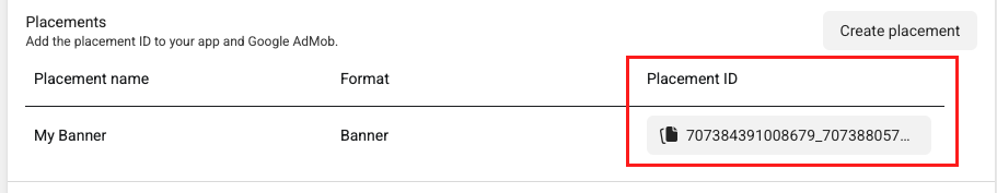 Select Google AdMob as the Mediation platform, then click Create placement.