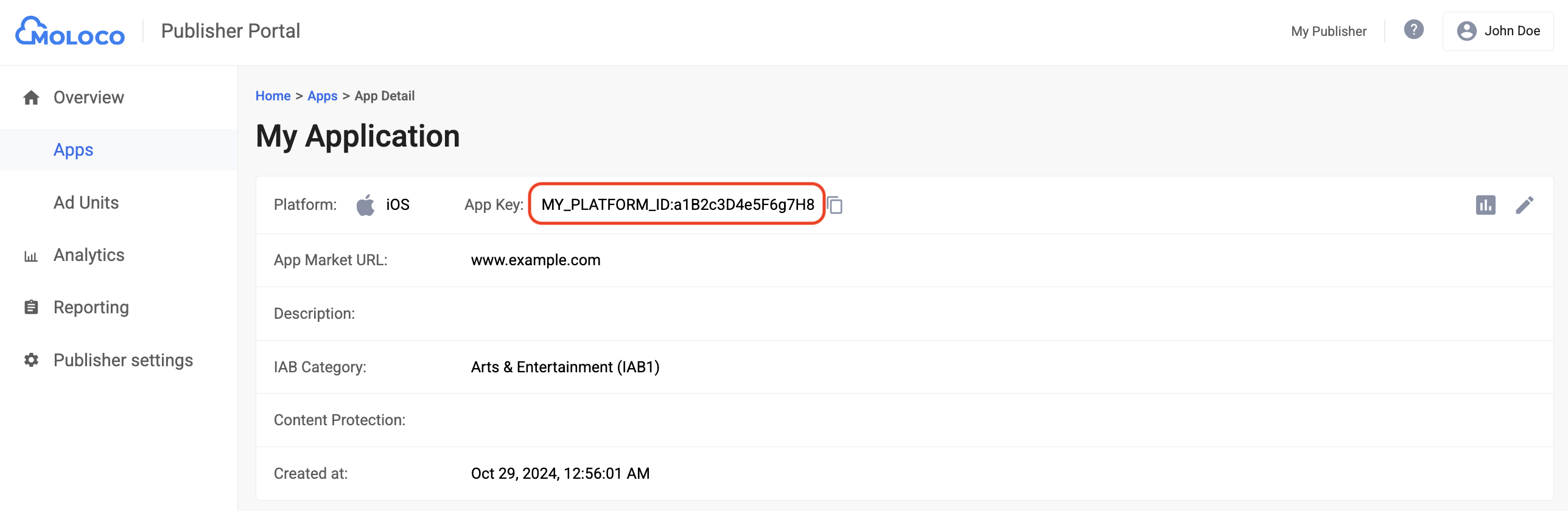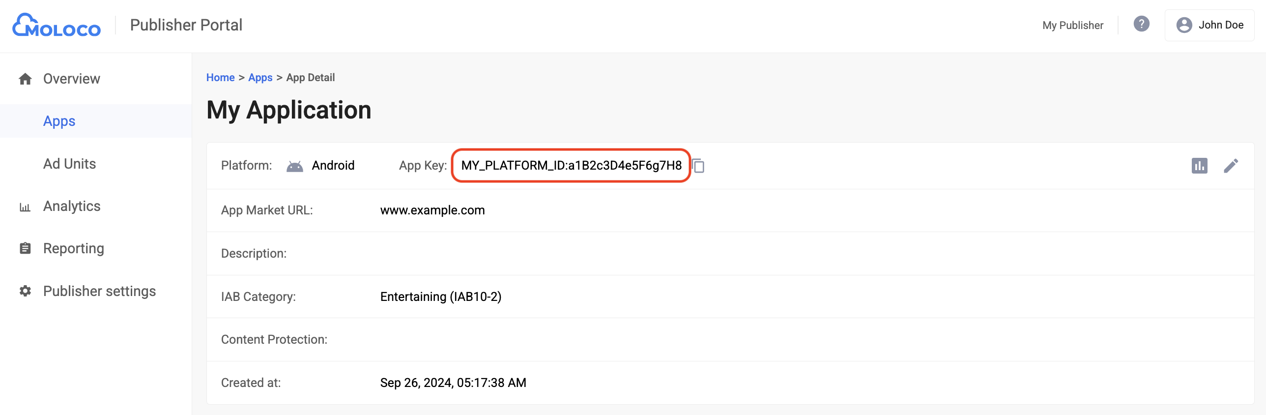 Once your app is created, select it from the Apps tab to view the details and take note of the App Key.