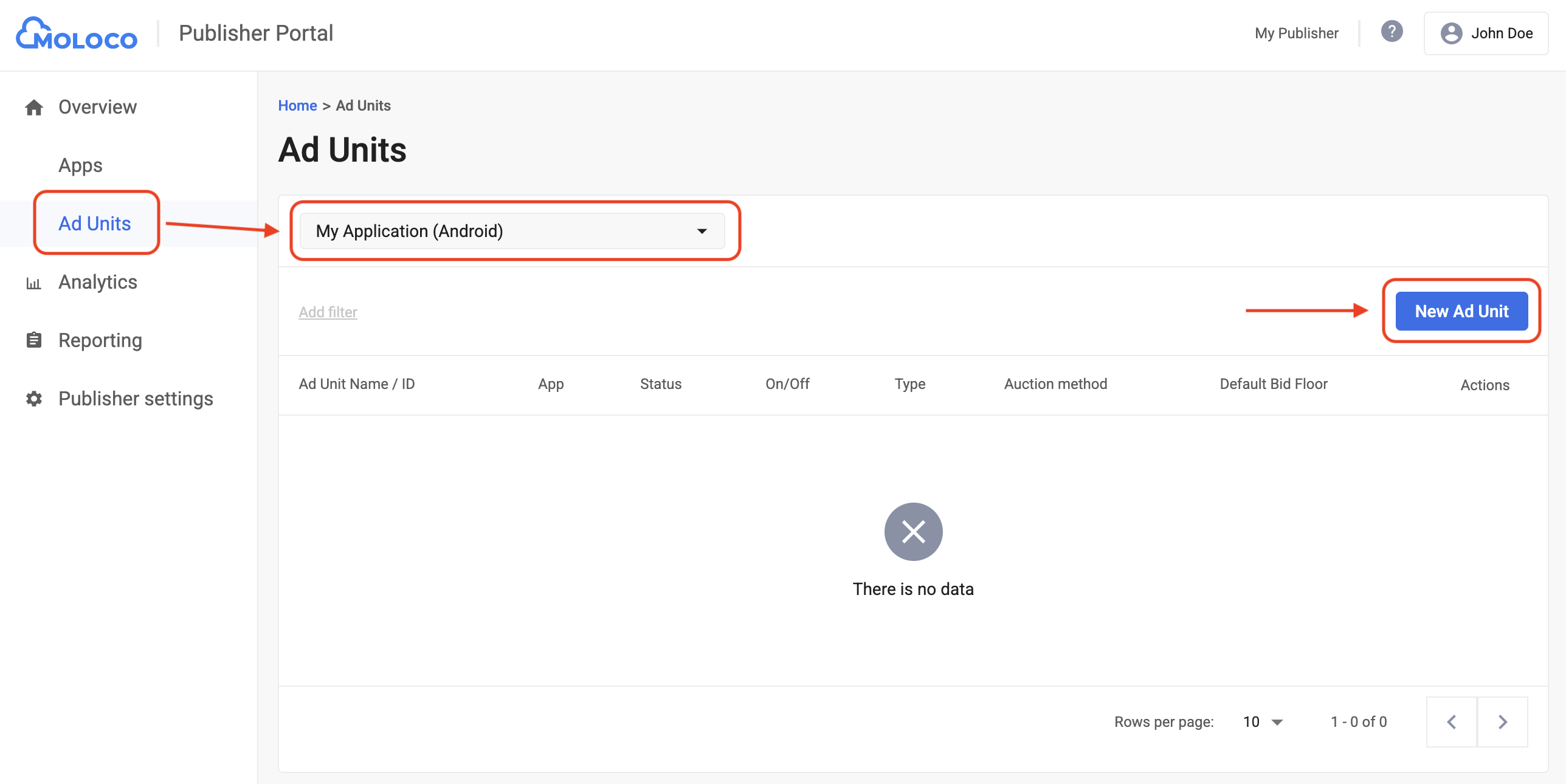 Navigate to the Overview > Ad Units tab, select the app from the drop-down menu, and then click New Ad Unit.