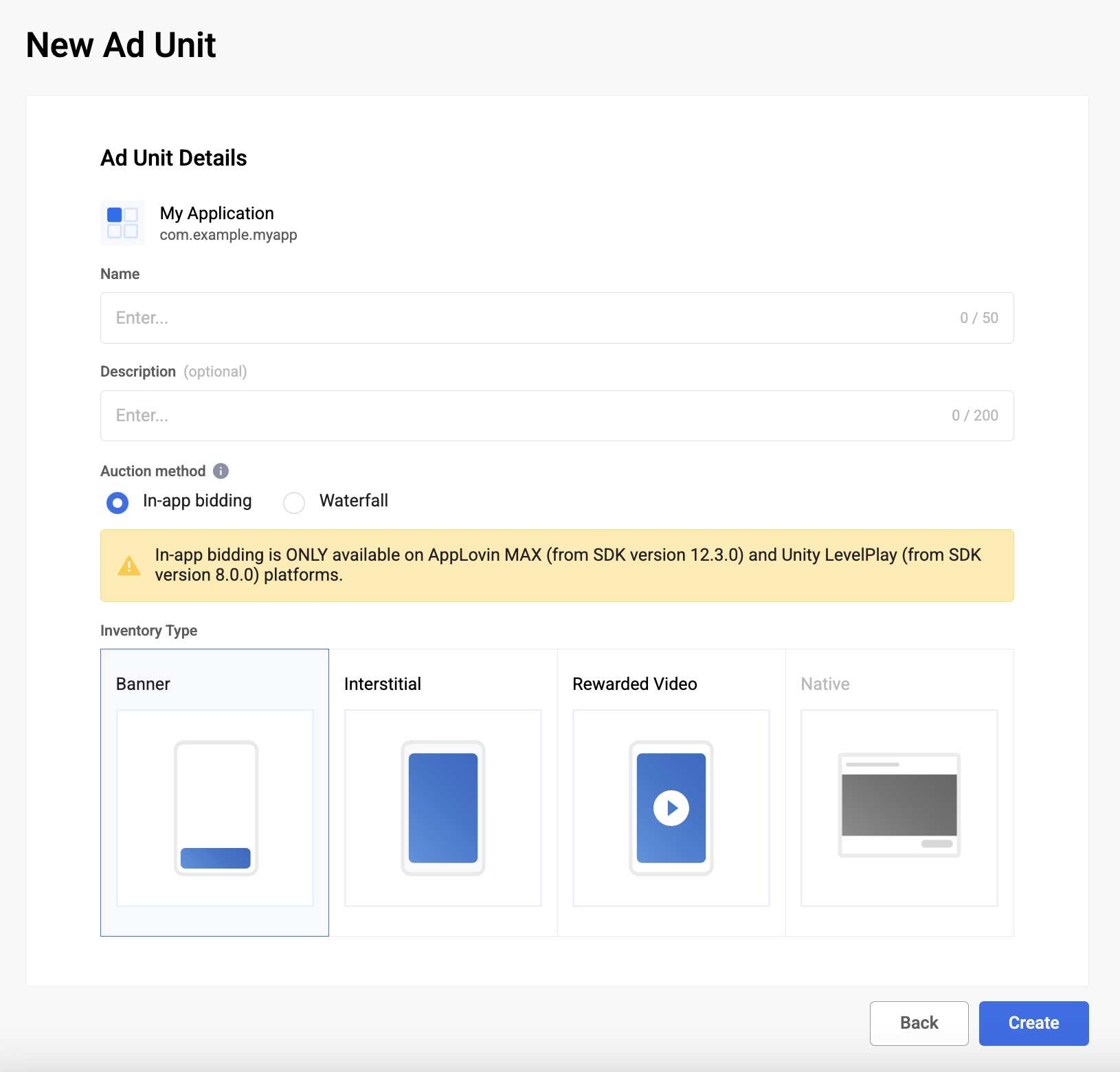 Select In-app bidding as the Auction method and fill out the rest of the form. Then, click Create.