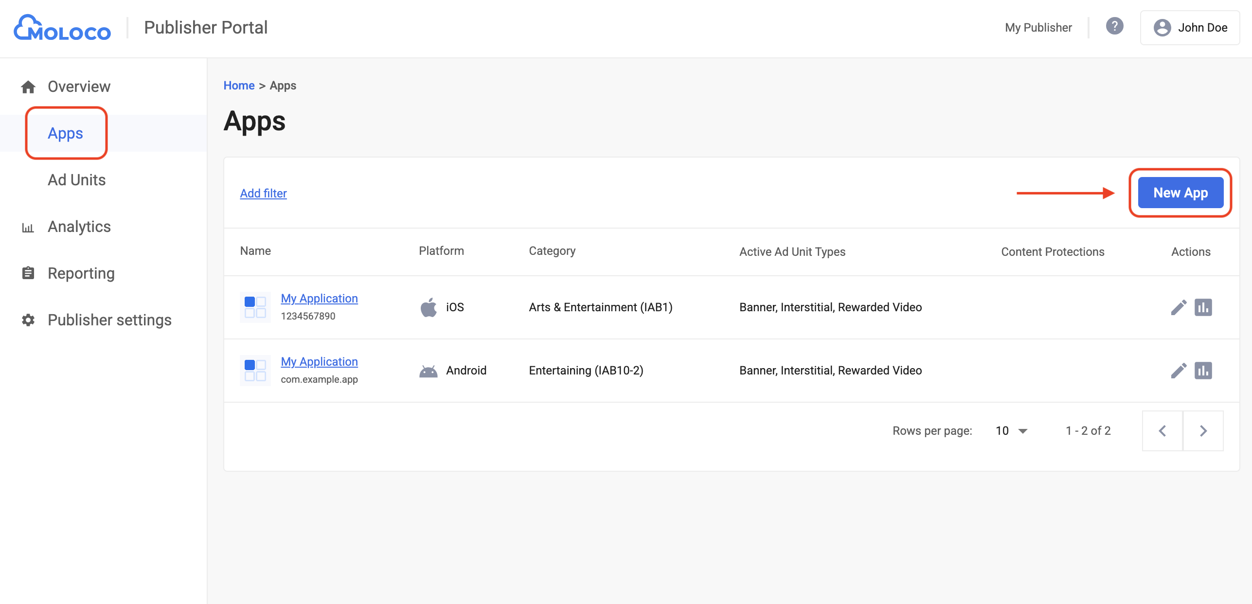 Navigate to Overview > Apps tab, then click the Add App button to create a new app.