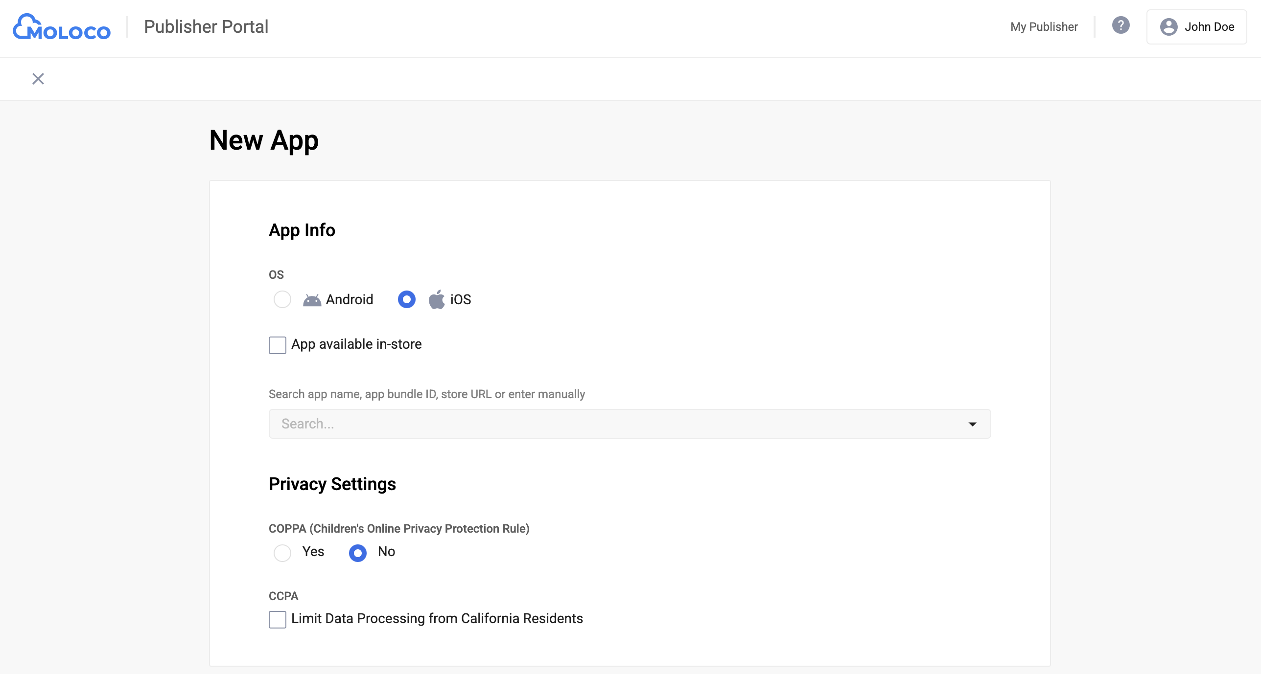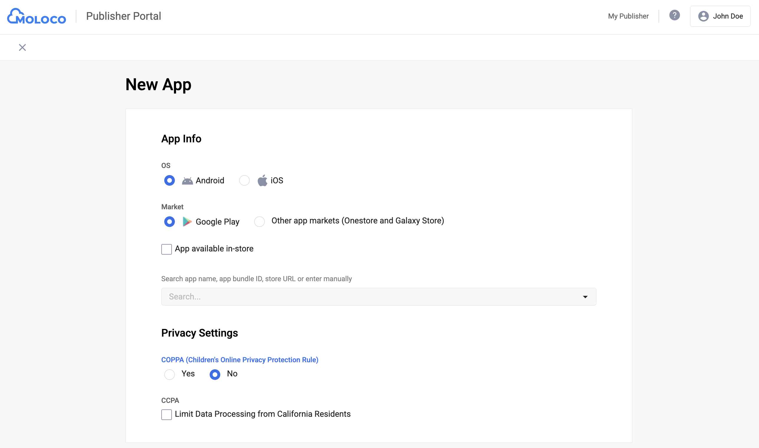 Select the OS and Privacy Settings for your app, fill out the rest of the form, and then click Create.