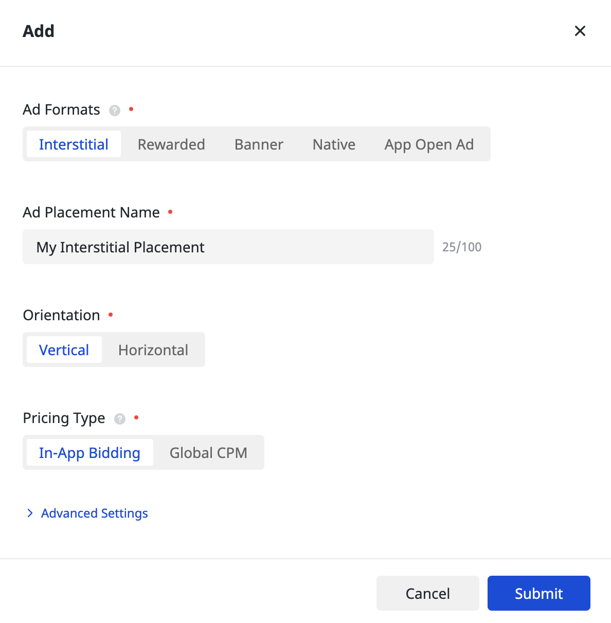 Select your Ad Format and Ad Placement Name, and select In-App Bidding as the Pricing Type. Fill out the rest of the form and click Submit.