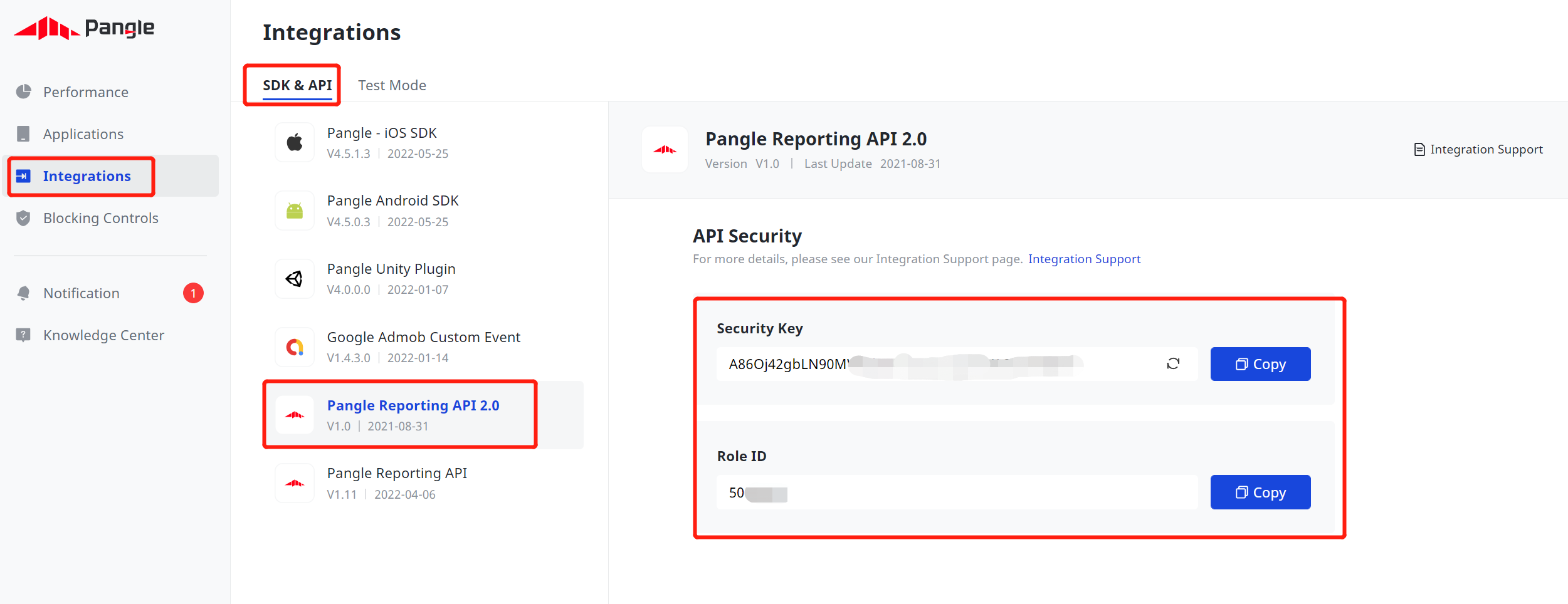 Click Integrations > SDK & API > Pangle Reporting API 2.0. Take note of Role ID and Security Key.