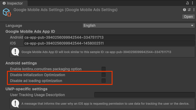 | Disable Optimize Initialization | Disables optimizing the MobileAds.initialize() initialization call. |