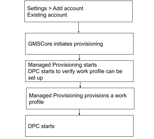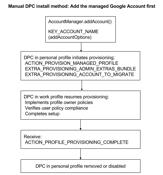 AccountManager.addAccount(). - The DPC starts running in the personal profile and initiates the process to