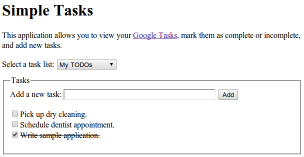 The sample web application Simple Tasks demonstrates how to use the Tasks service for both read and write operations. You can view the full source code on our GitHub repository.