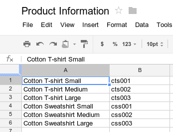 Suppose you have a list of product names and product numbers that you store in a spreadsheet, as shown in the image below.
