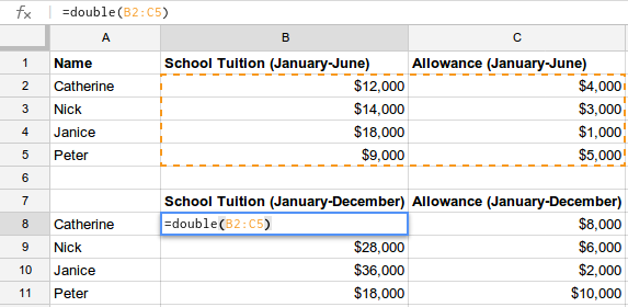 =DOUBLE(A1:B10)), the argument will be a two-dimensional array of the cells' values. For example, in the screenshot below, the arguments in=DOUBLE(A1:B2)are interpreted by Apps Script asdouble([[1,3],[2,4]]). Note that the sample code forDOUBLEfrom above would need to be modified to accept an array as input.