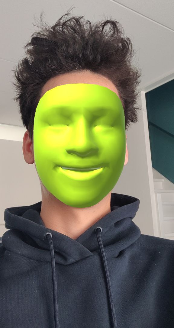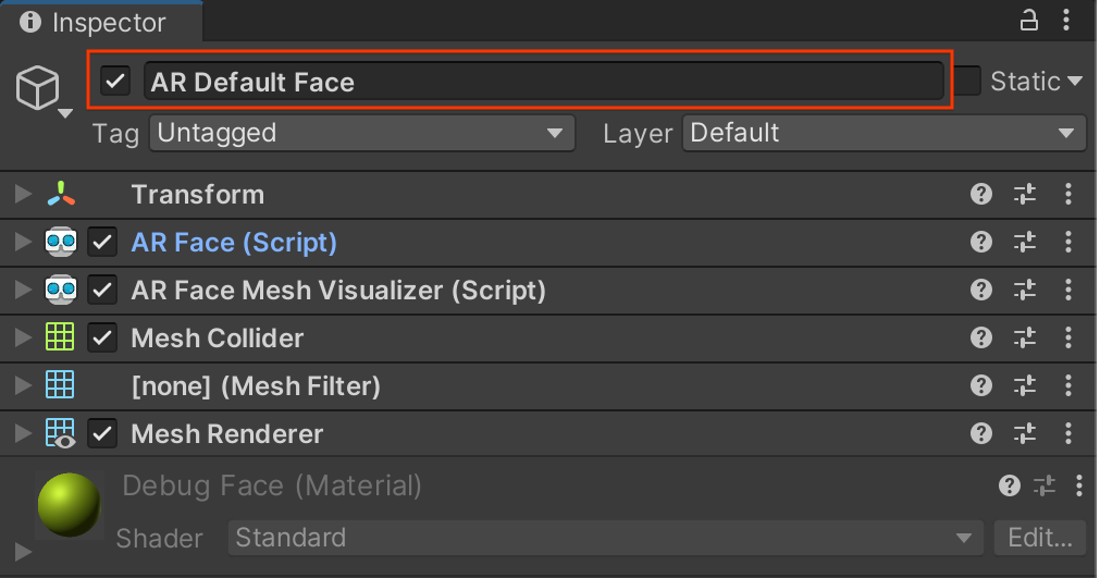 To visualize the face mesh, attach an ARFaceMeshVisualizer to the Face Prefab. The ARFaceMeshVisualizer will generate a Mesh that corresponds to the detected face, setting it as the mesh in the attached MeshFilters and MeshColliders. Use a MeshRenderer to set the Material used to render the face.