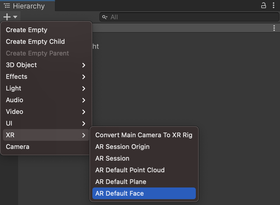 ARFaceManager. In the Hierarchy tab, use + > XR > AR Default Face to create a new face object. This object is temporary and can be deleted once you create the Face Prefab.