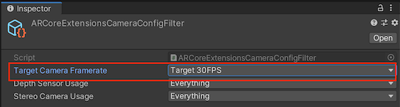 If your app does not need a faster camera frame rate, you can limit it to 30 FPS. On devices that support a 60 FPS camera frame rate, ARCore will prioritize camera configs that support that frame rate by default. To filter out all camera configs that support 60 FPS, make sure that Target Camera Framerate is set to Target 30FPS.