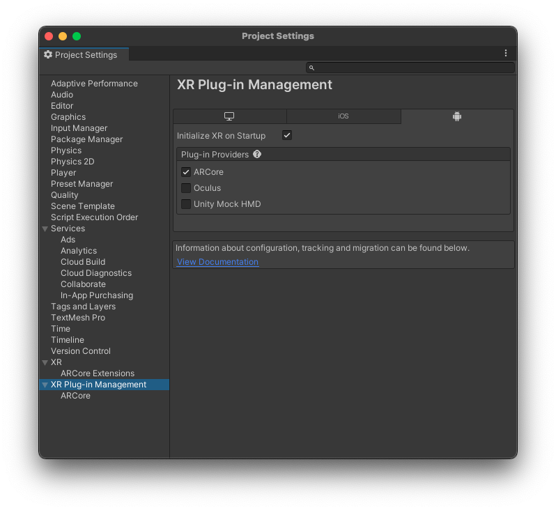 5. Navigate to Edit > Project Settings. In XR Plug-in Management, open the Android tab and enable ARCore.