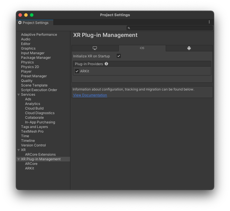5. Navigate to Edit > Project Settings. In XR Plug-in Management, open the iOS tab and enable ARKit.