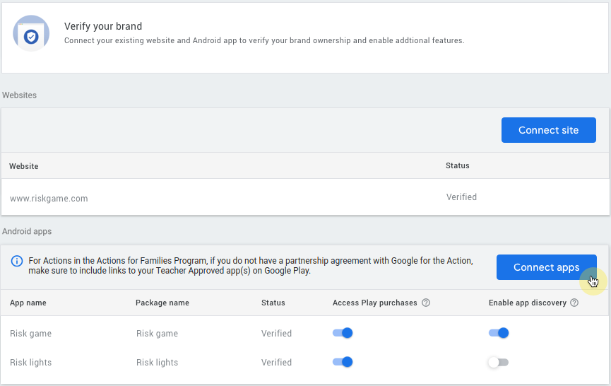 Click Connect site and provide the URL to your website if you want to verify your brand in order to claim reserved invocation names.