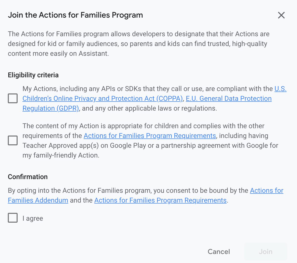 Before building and submitting your Action for the Actions for Families program, ensure it complies with program requirements, COPPA, GDPR, and other applicable laws and regulations to be appropriate for the whole family.