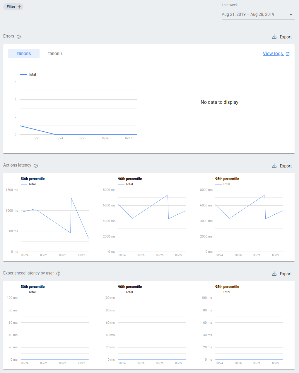 Action latency: The latency of your Action's endpoint. If latency is very high or regularly spikes, your users may be experiencing delays while interacting with your Action.