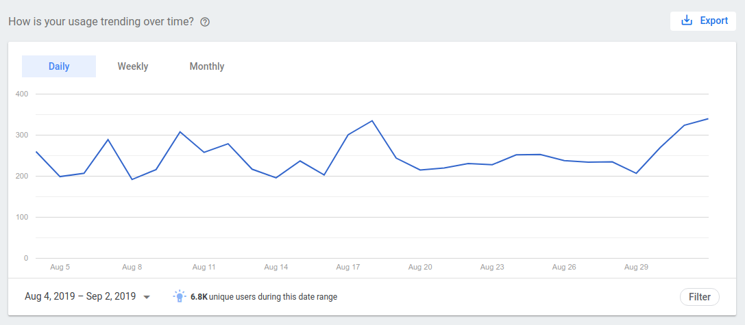 The Usage page displays three graphs, which pertain to the usage data of your Action. You can export data in the following graphs in CSV format.