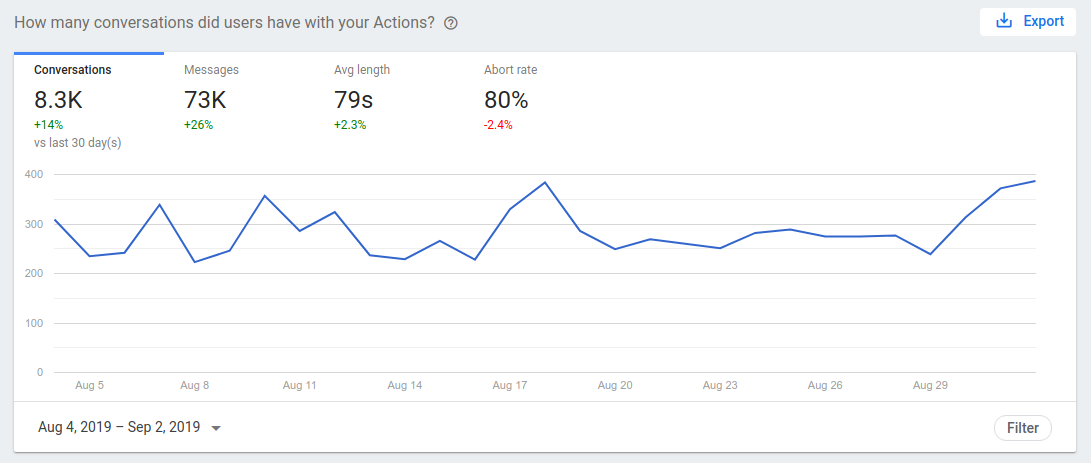 - Conversations: The number of conversations users had with your Action. A conversation is a single, complete interaction with your Action, starting from invocation and ending with the user exiting the context of your Action.