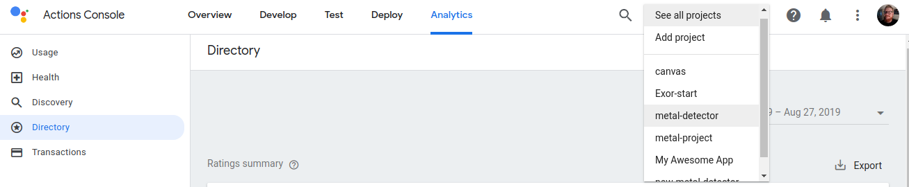 In the Actions console, you can click the drop-down menu in the main navigation to switch between projects, as shown in the following screenshot: