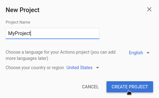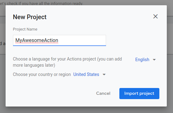 If you want to build your Action on top of an existing Cloud project or an existing Firebase project, choose that project in the drop-down menu inside the New project dialog. As you start typing, existing project names appear. Click on the project you want to import.