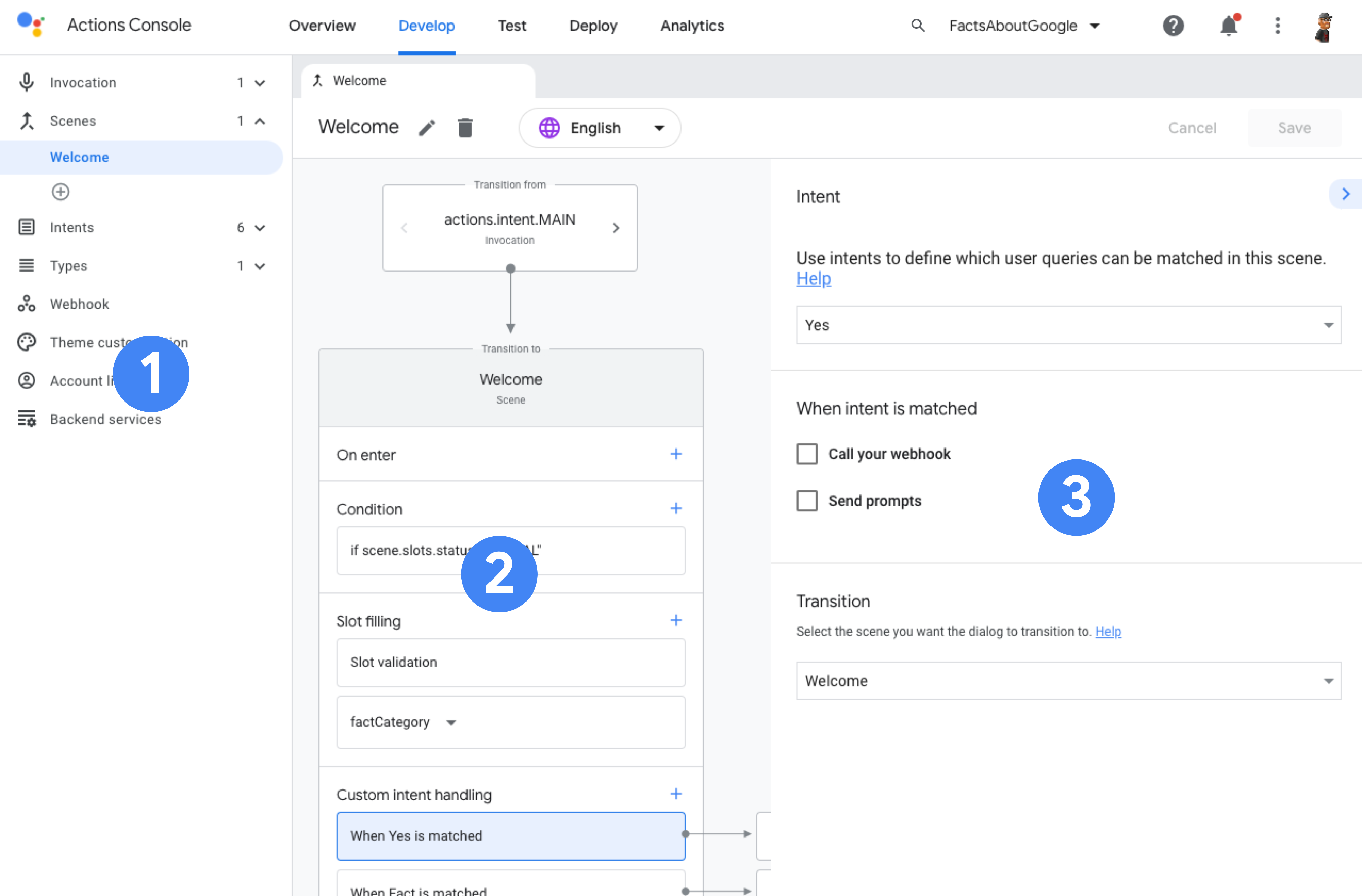 The Develop section of the console houses the visual web-based IDE, Actions Builder, which is built on top of the Actions SDK.
