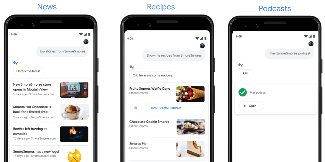 | Media | Users can discover your content on Google Search and Assistant, and initiate playback of the content directly on your app or platform. For information on setting up your media content, see the Media Actions documentation. |