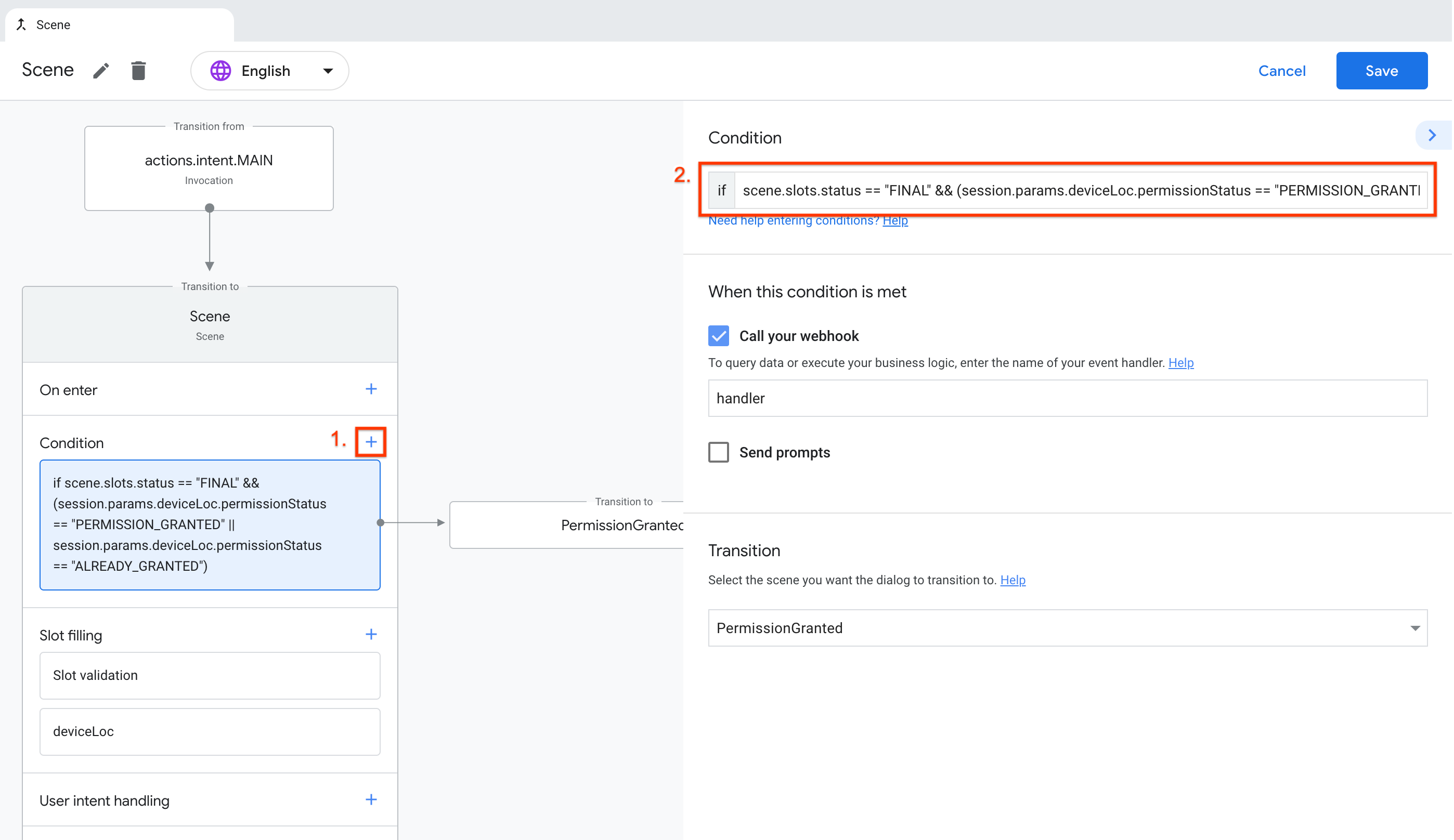 session.params.<slot_name>.permissionStatus in the condition of a scene.