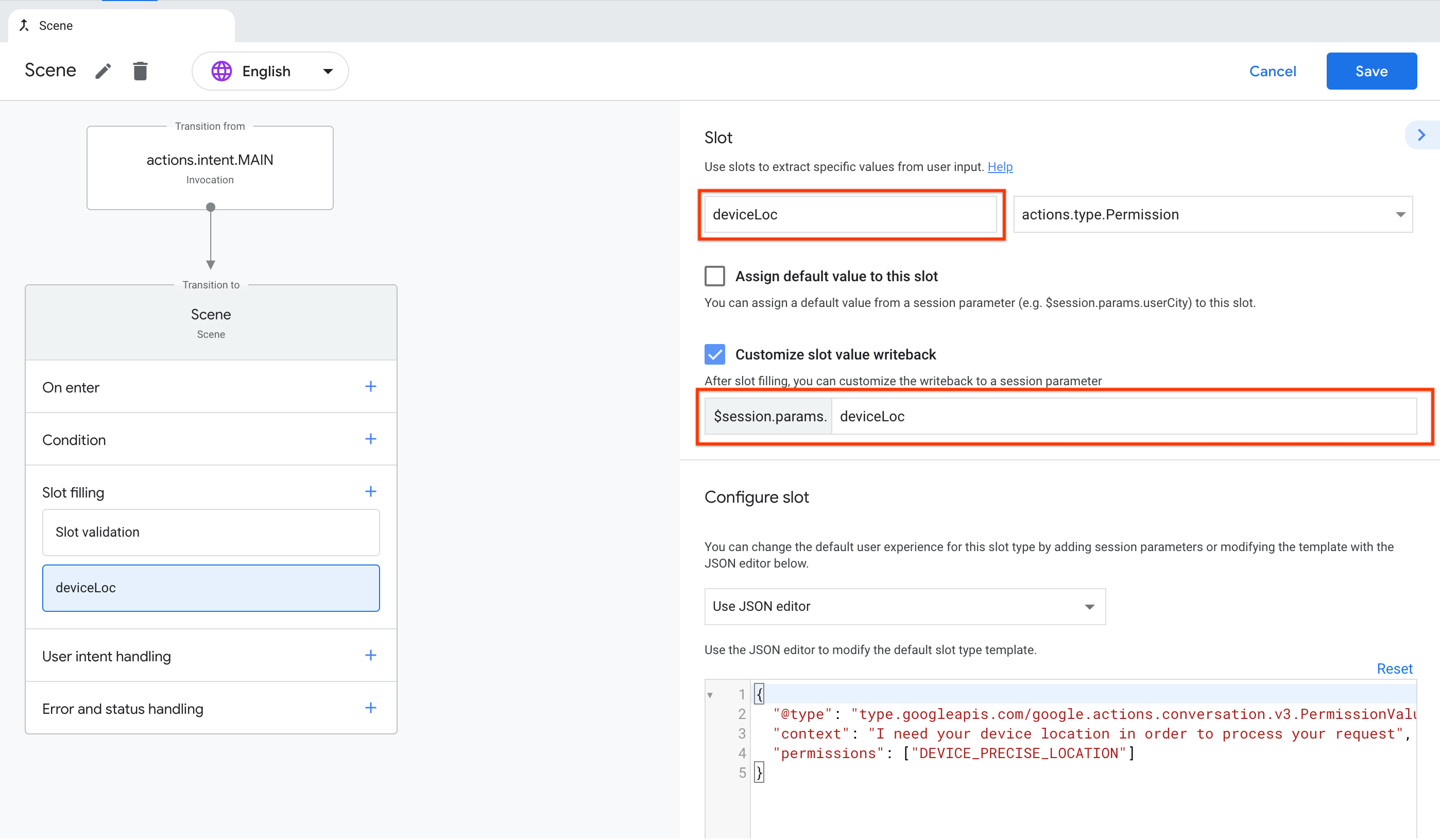 To set up permissions for your Action, you add a new slot type to the scene. You then configure the slot for the data permission you want to request.