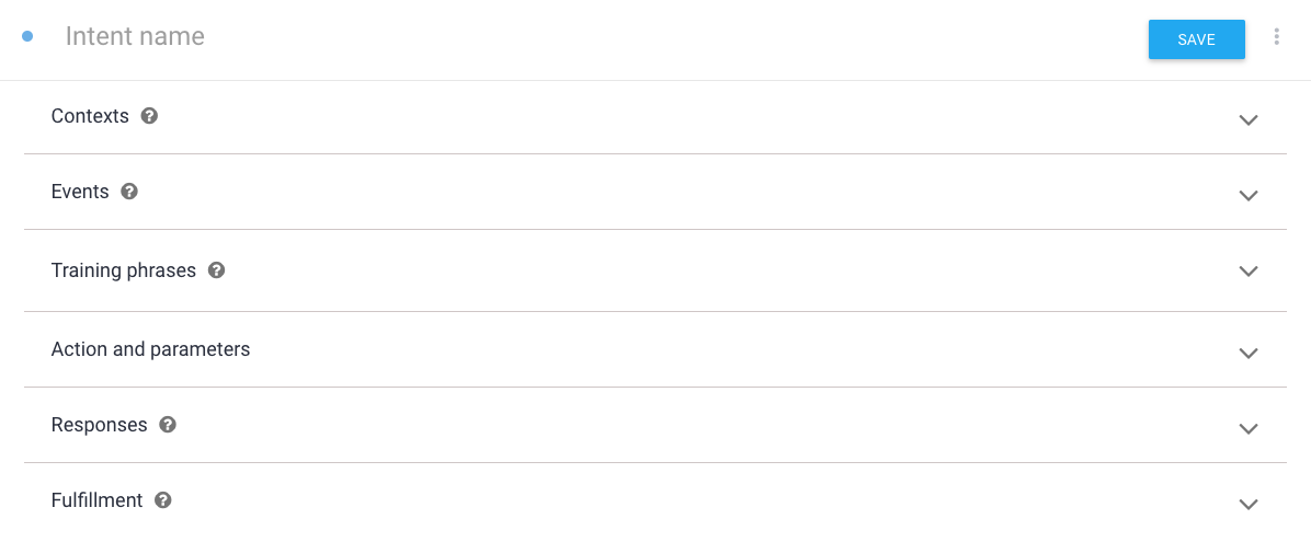 Click the + sign by the Intents menu item in Dialogflow's left navigation. The Intent Editor appears where you can enter the following information: