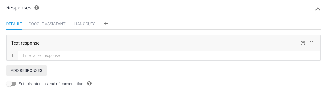 In the Responses area, provide the textual response you want to return to users. Default text responses are simple TTS text responses that can work across multiple Dialogflow integrations. Responses for Google Assistant are described on the Responses page.