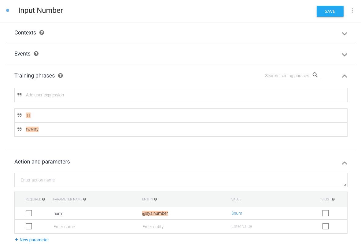Action and parameters defines what data to pass to fulfillment, if fulfillment is enabled for this intent. This includes data parsed from the user input and the name that you can use in your fulfillment to detect which intent was triggered. You'll use this name later to map your intent to its corresponding fulfillment logic. See Actions and parameters in the Dialogflow documentation for more information about defining Actions.