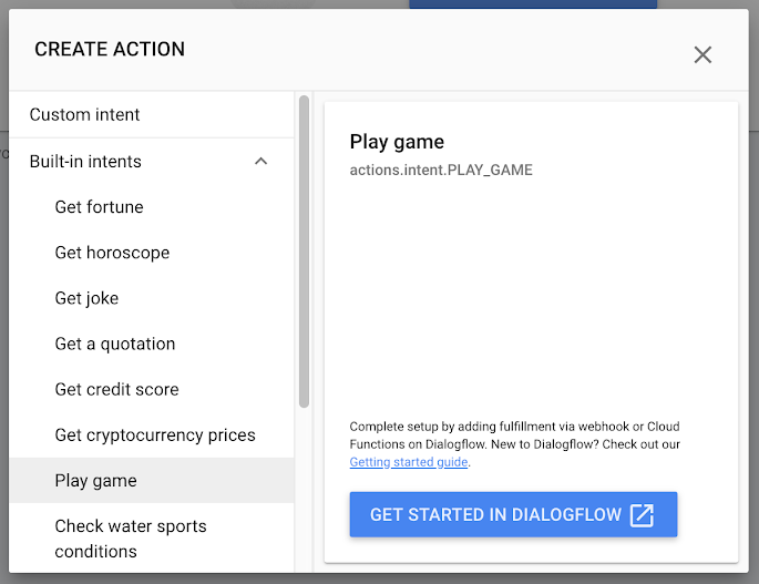 Under Built-in intents, select Play game and click Get started in Dialogflow.