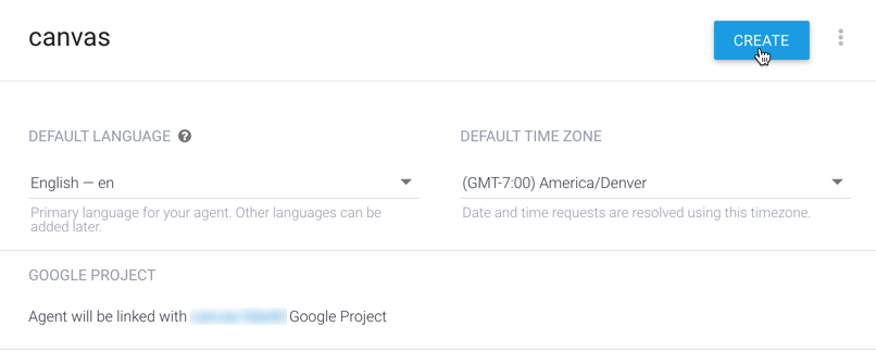 On the agent creation page, confirm the default language, time zone, and name for the agent and click CREATE.
