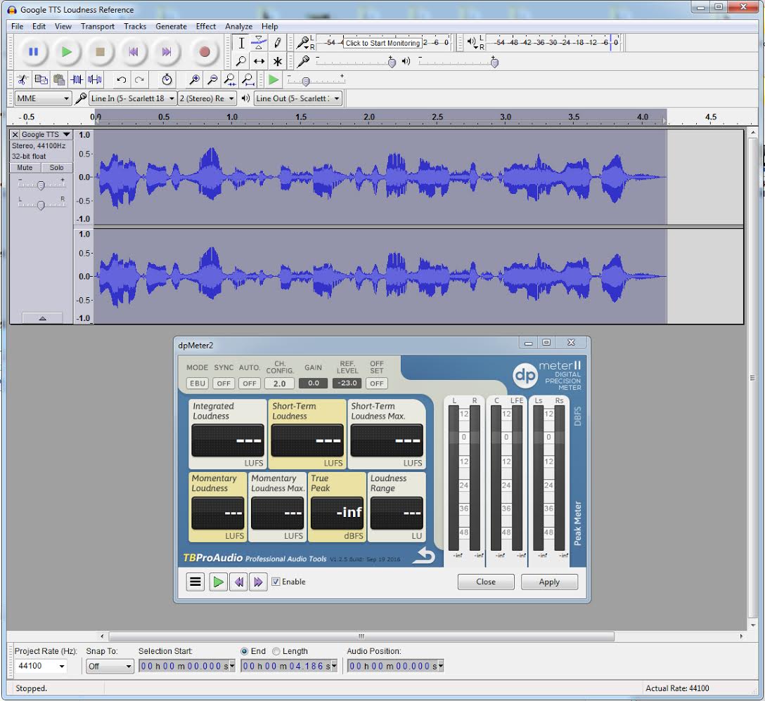 - Use dpMeter II to measure the loudness of the Google TTS Loudness Reference to establish a baseline LUFS reading. If your DAW is measuring higher or lower than -16 LUFS for the Google TTS Loudness Reference, match your audio to the baseline of your DAW. For example, in Audacity, dpMeter II measures an integrated loudness of -15.1 LUFS, so the new target loudness for your program should be -15.1 LUFS.
