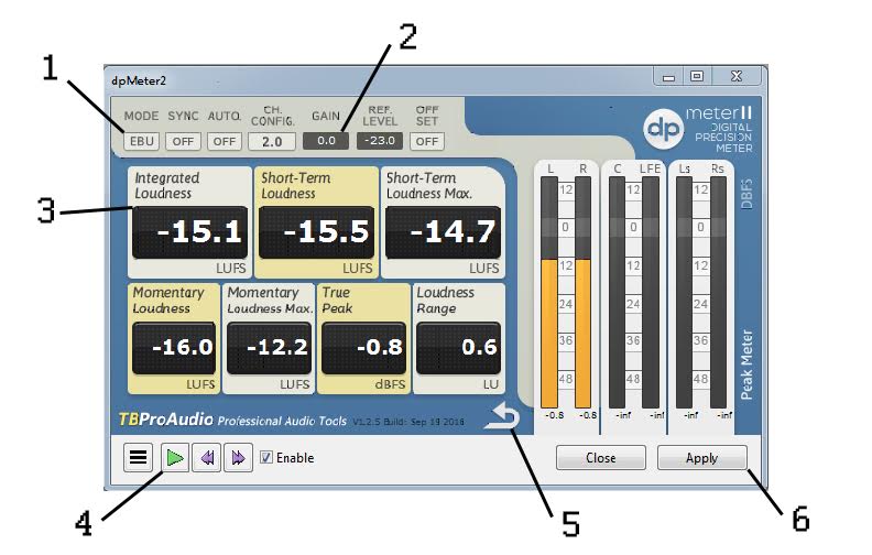 Click the green play button in dpMeter II or press play (spacebar) in your DAW (number 4 below) to measure the loudness of the file.