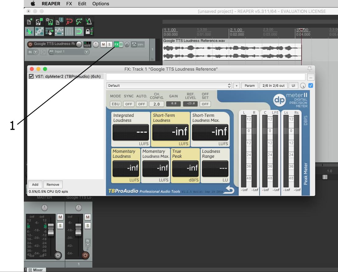 - Setup a digital audio workstation (DAW) and LUFS meter to measure audio loudness compared to the Google TTS Loudness Reference.