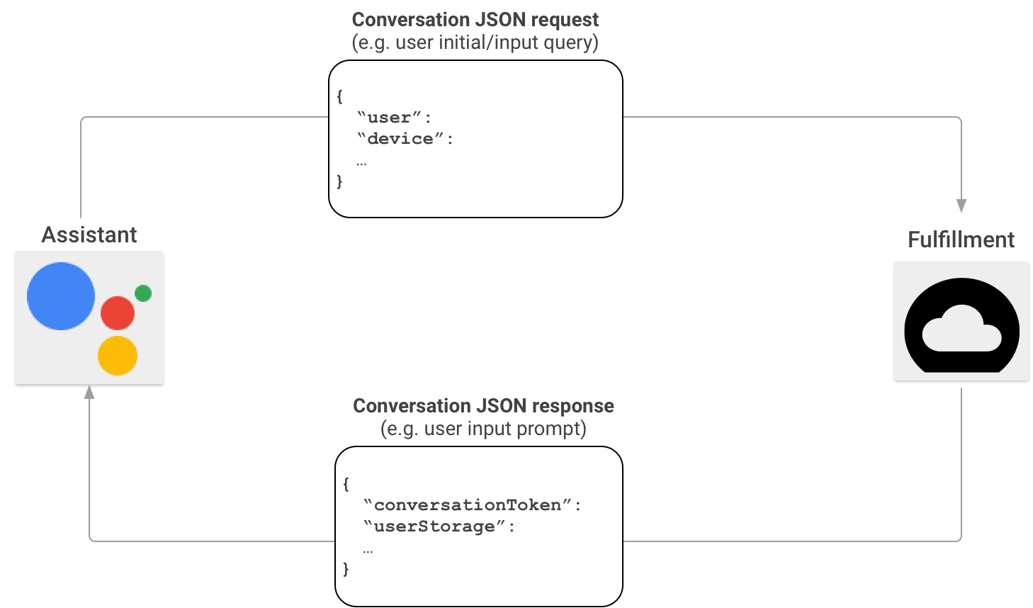 Once Actions on Google establishes that your fulfillment is a suitable match for the user's invocation, it starts a conversation session by sending an HTTP request that contains a JSON payload with the user's request information to your fulfillment endpoint. Your fulfillment parses the request and returns a response that contains a JSON payload. Actions on Google then converts the payload into rendered speech and multimedia output for users.