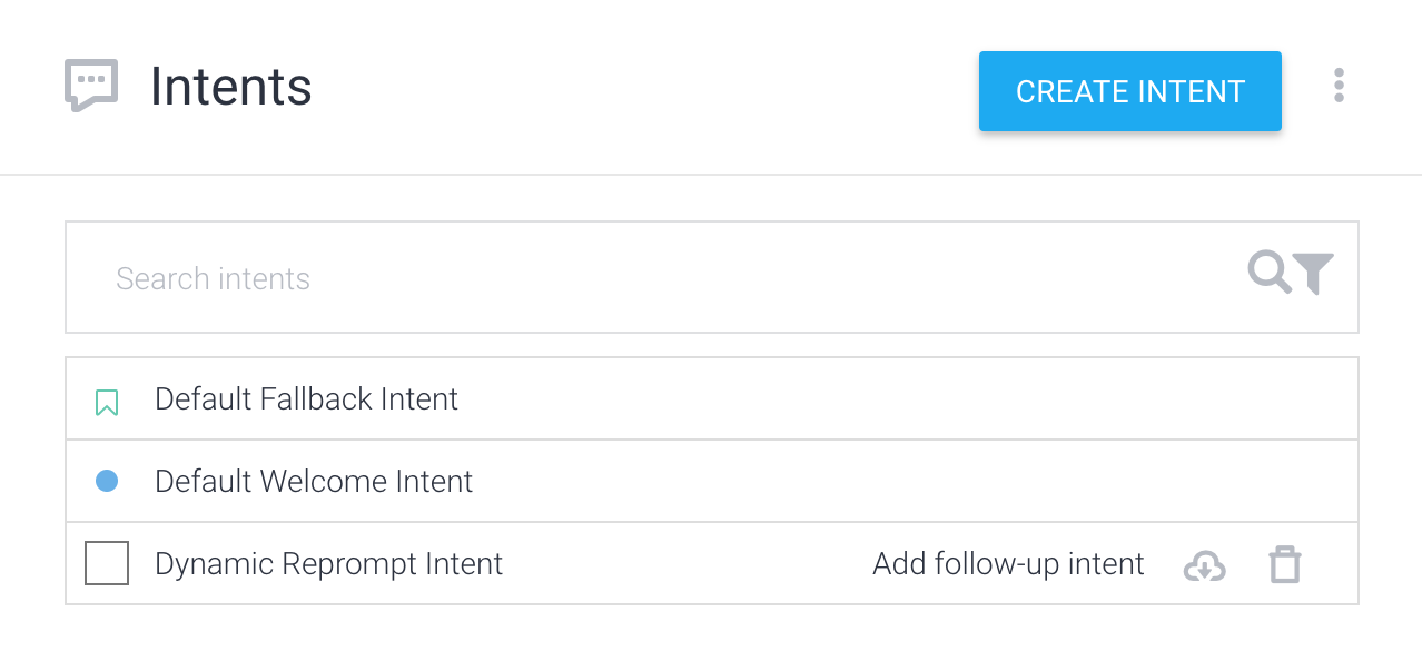 Follow-up intent - Follow-up intents are enforced through Dialogflow contexts, ensuring reprompts are triggered only after certain turns of the conversation. This is useful for tailored reprompts that you want to apply to specific situations.