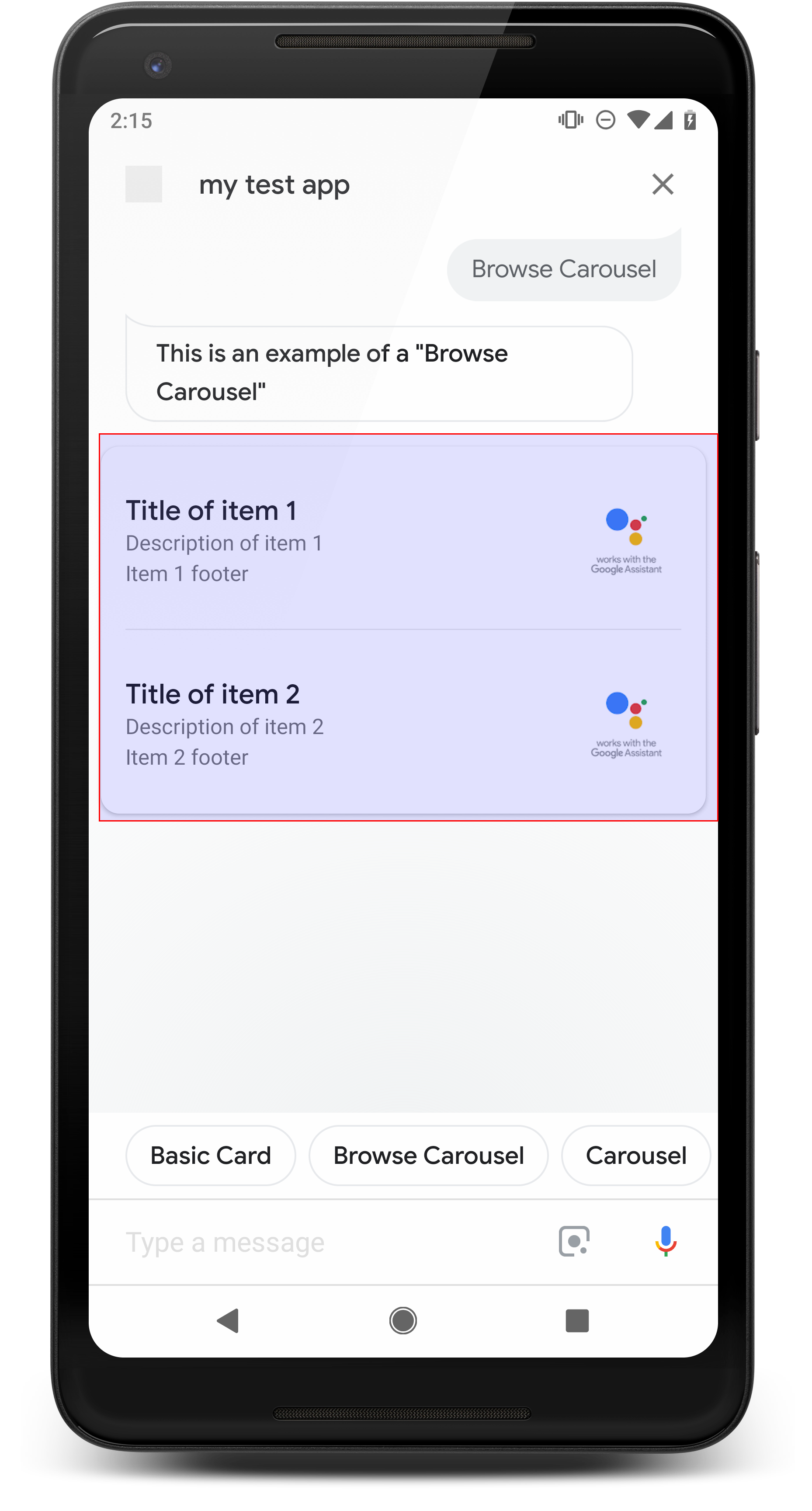 A browsing carousel is a rich response that allows users to scroll vertically and select a tile in a collection. Browsing carousels are designed specifically for web content by opening the selected tile in a web browser (or an AMP browser if all tiles are AMP-enabled). The browsing carousel also persists on the user's Assistant surface for browsing later.