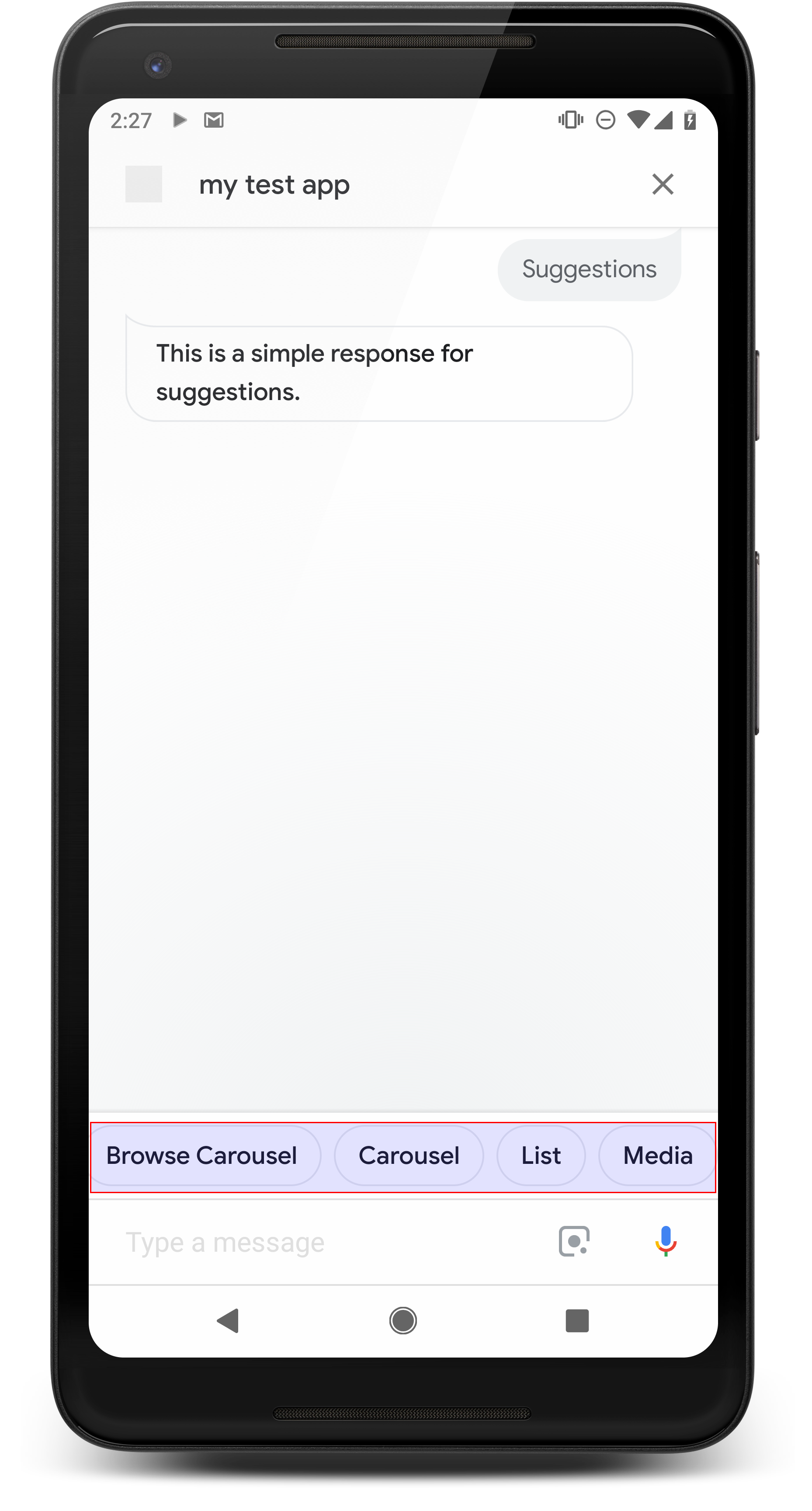Use a rich response if you want to display visual elements to enhance user interactions with your Action. These visual elements can provide hints on how to continue a conversation.
