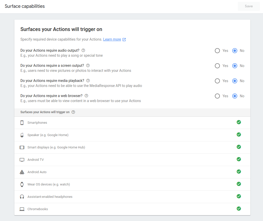actions_capability_audio_output- The device has a speaker.actions_capability_screen_output- The device has an output display screen.actions_capability_media_response_audio- The device supports playback of media content.actions_capability_web_browser- The device supports a web browser. (This capability is currently not available for smart displays.)