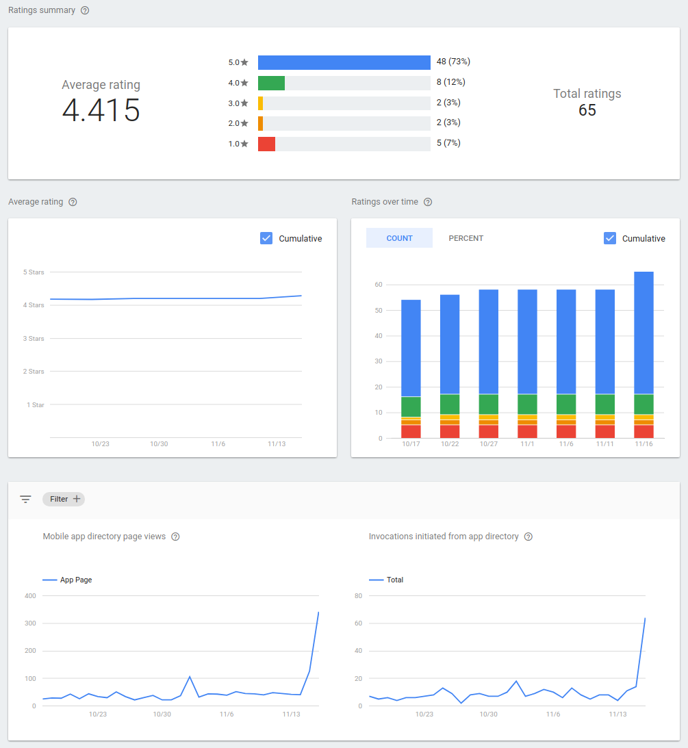 The Actions console provides analytics on how your Action is rated in the mobile Assistant directory.