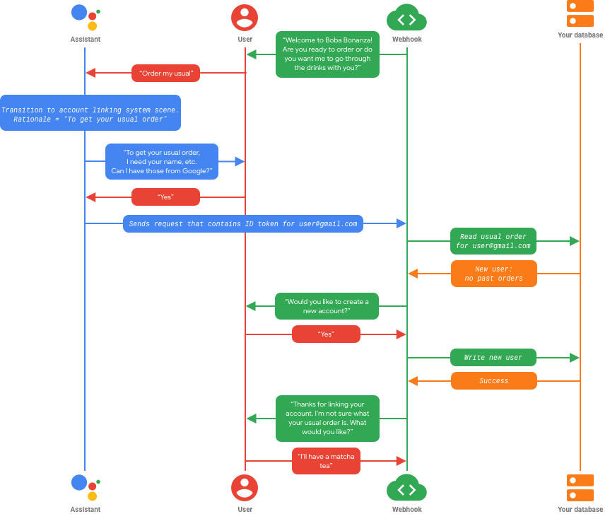After the user consents, Assistant sends a request that contains the profile information for user@gmail.com. In this case, the information contained in the Google ID token for user@gmail.com matches an account in your system, so the user’s identity in your Action is automatically linked to that account. Your webhook can then read the user’s usual order from a database and respond accordingly.