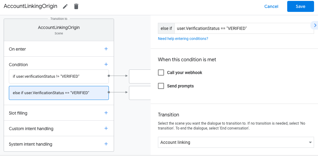 Enter new expressionfield under Condition, enter the following logic::user.verificationStatus == "VERIFIED" - Under Transition, select the Account Linking system scene.