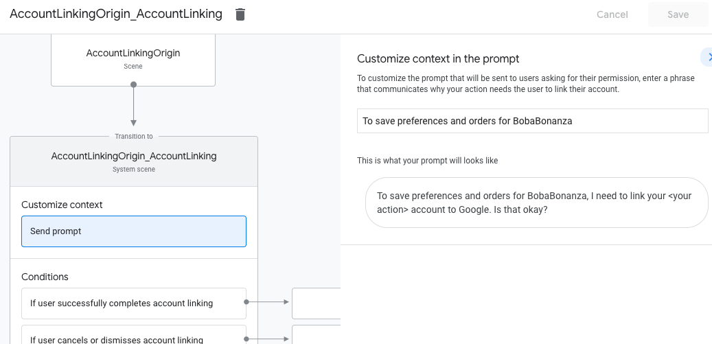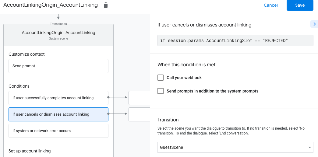 - Configure how the flow should proceed if the user doesn't agree to link their account. For example, send an acknowledging message and redirect to scenes that provide functionality that doesn't require account linking.