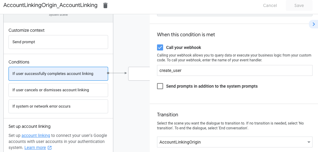 - Configure how the flow should proceed if the user agrees to link their account. For example, call the webhook to process any custom business logic required and transition back to the originating scene.