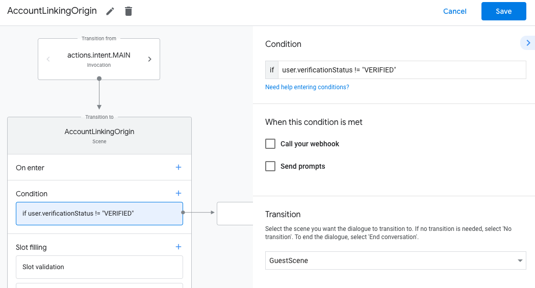 Enter new expressionfield under Condition, enter the following logic:user.verificationStatus != "VERIFIED" - Under Transition, select a scene that doesn't require account linking or a scene that is the entry point to guest-only functionality.