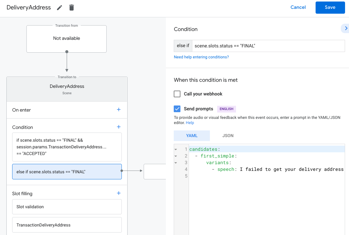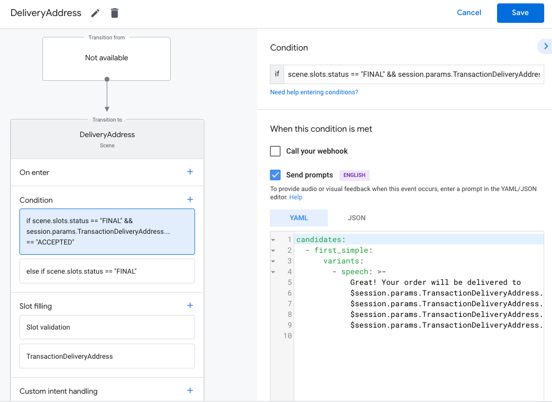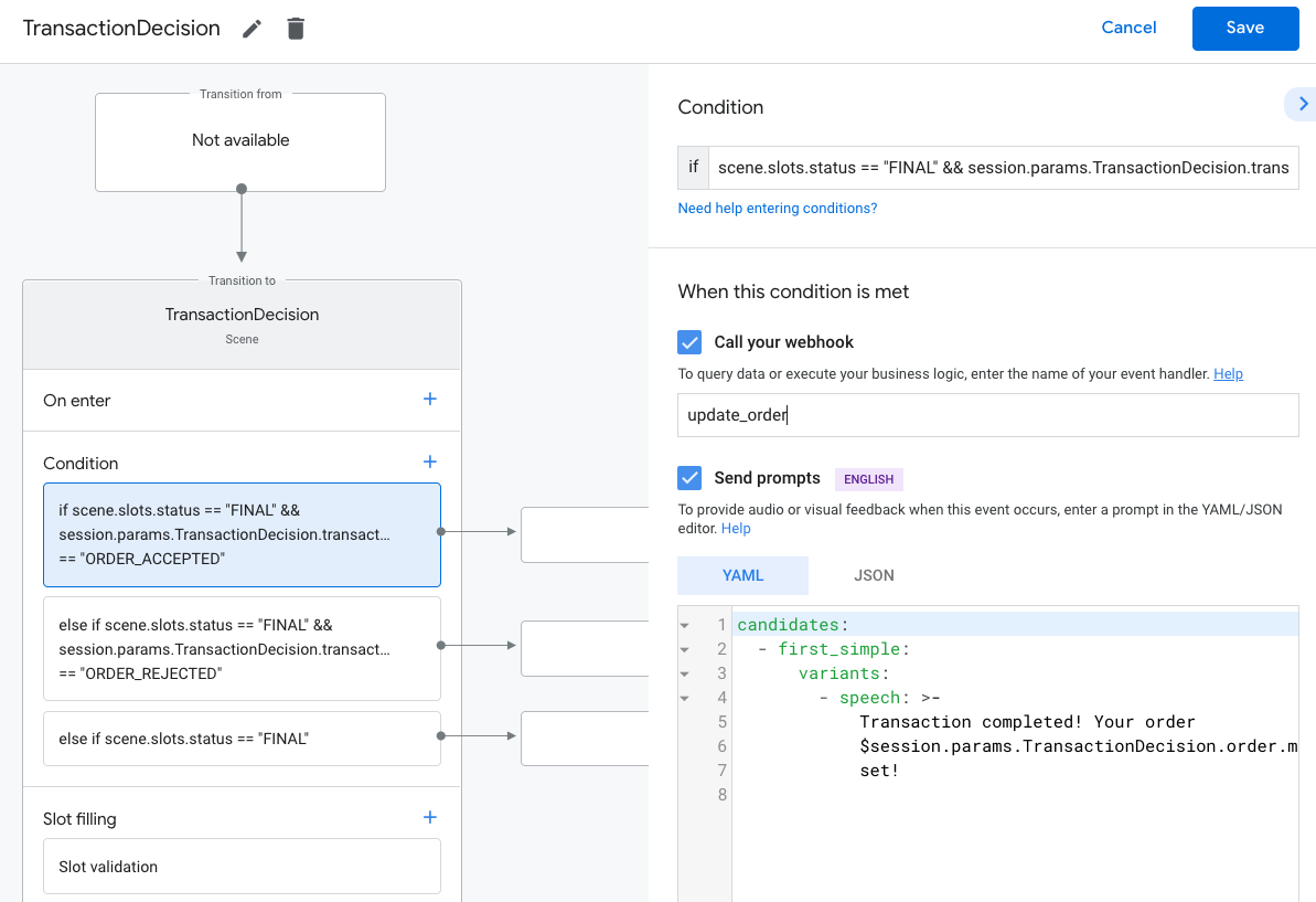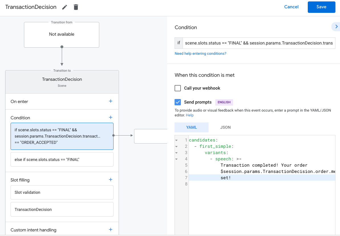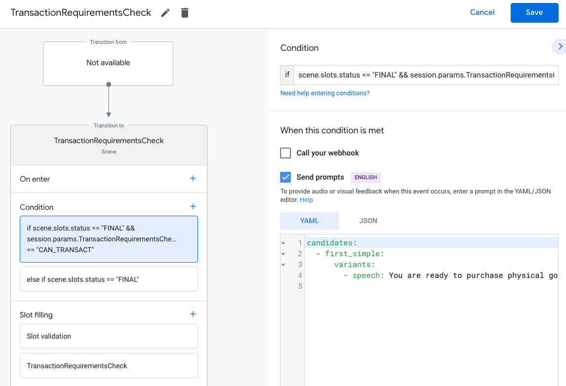 scene.slots.status == "FINAL" && session.params.TransactionRequirementsCheck.resultType == "CAN_TRANSACT"Hover your cursor over the condition you just added and click the up arrow to place it before